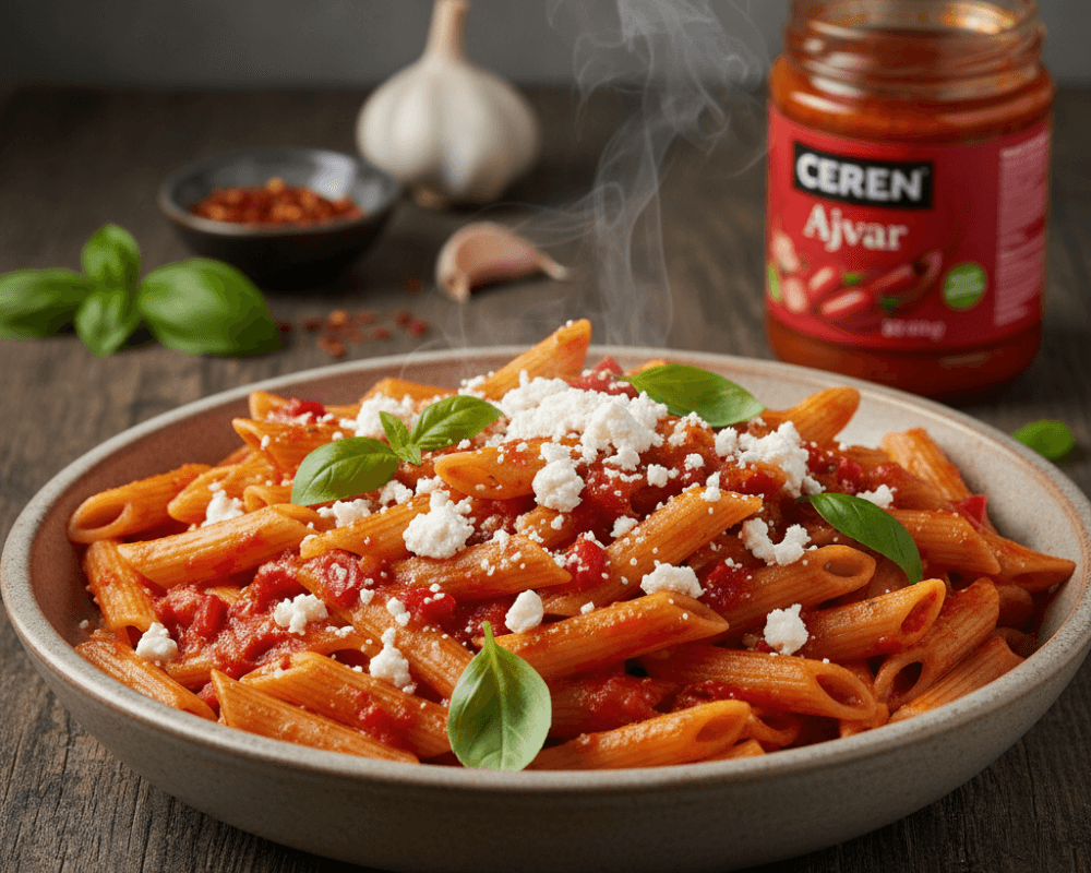 A modern Mediterranean-inspired pasta where CEREN Ajvar is used as a quick, smoky sauce.