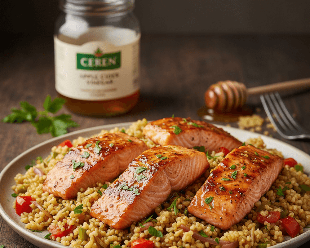 A modern, light dish where CEREN Apple Cider Vinegar is used in both the marinade and the glaze for brightness.