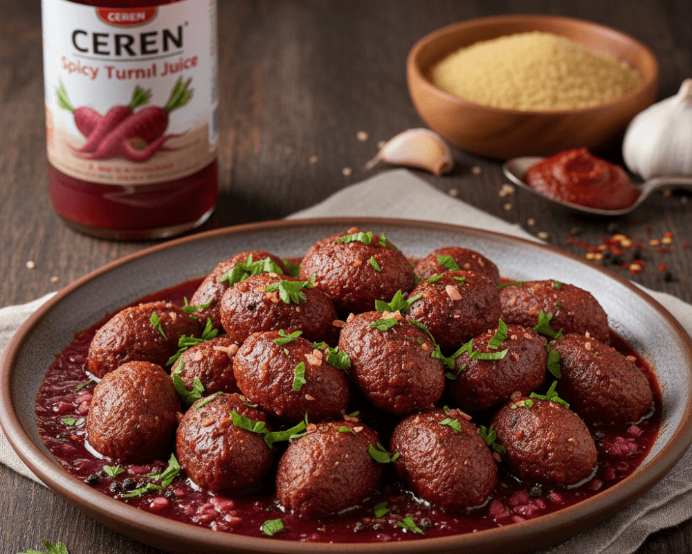 A unique and flavorful dish where classic bulgur köftes are paired with a tangy sauce made from CEREN Spicy Turnip Juice. The spicy, sour notes of şalgam bring a refreshing twist to this traditional recipe.
