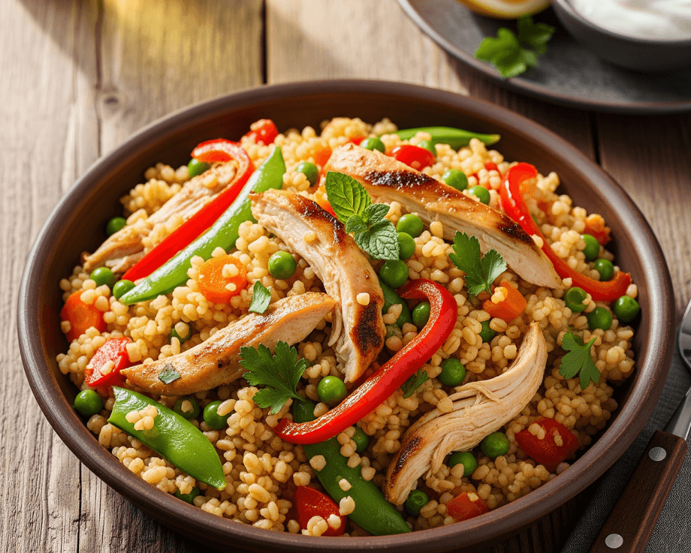 A complete one-pot meal with CEREN Bulgur for Pilaf, chicken, and seasonal vegetables.