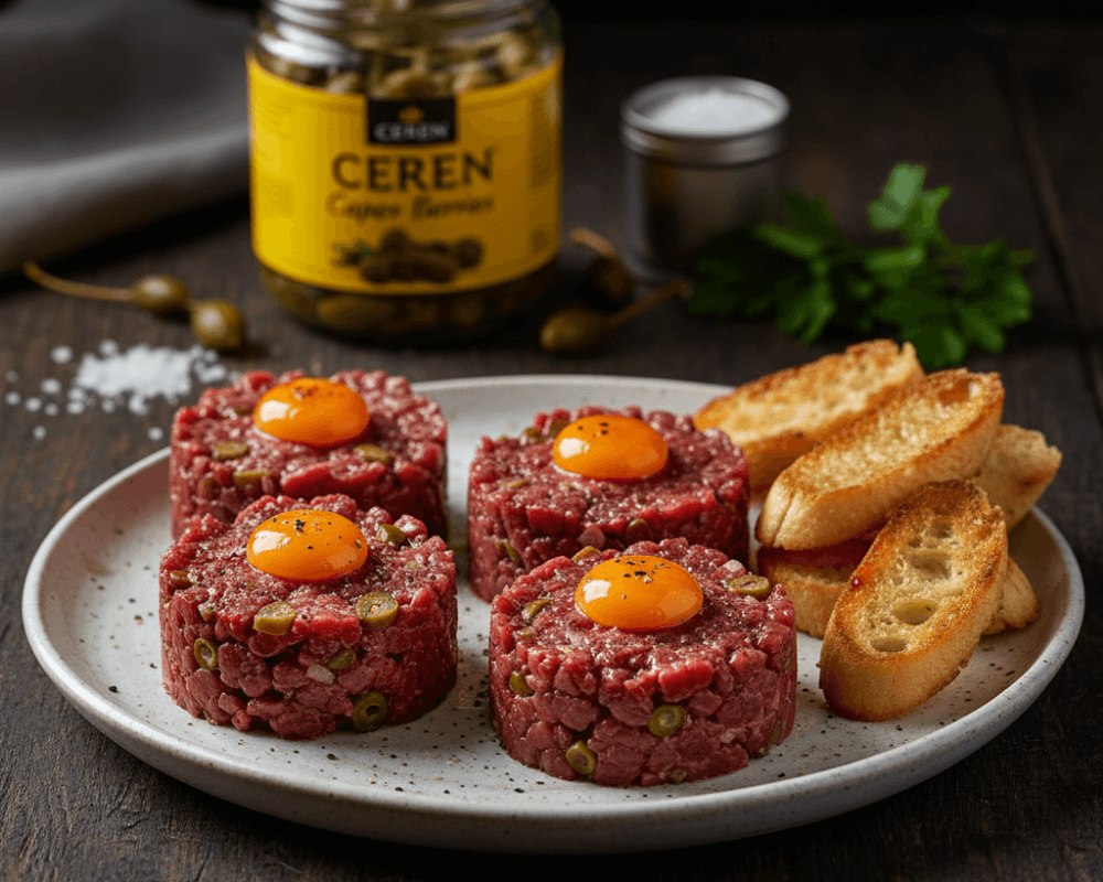 Mix flavors: In a bowl, combine beef with shallot, Dijon mustard, Worcestershire, olive oil, and sliced CEREN Caper Berries. Season generously with salt and pepper.