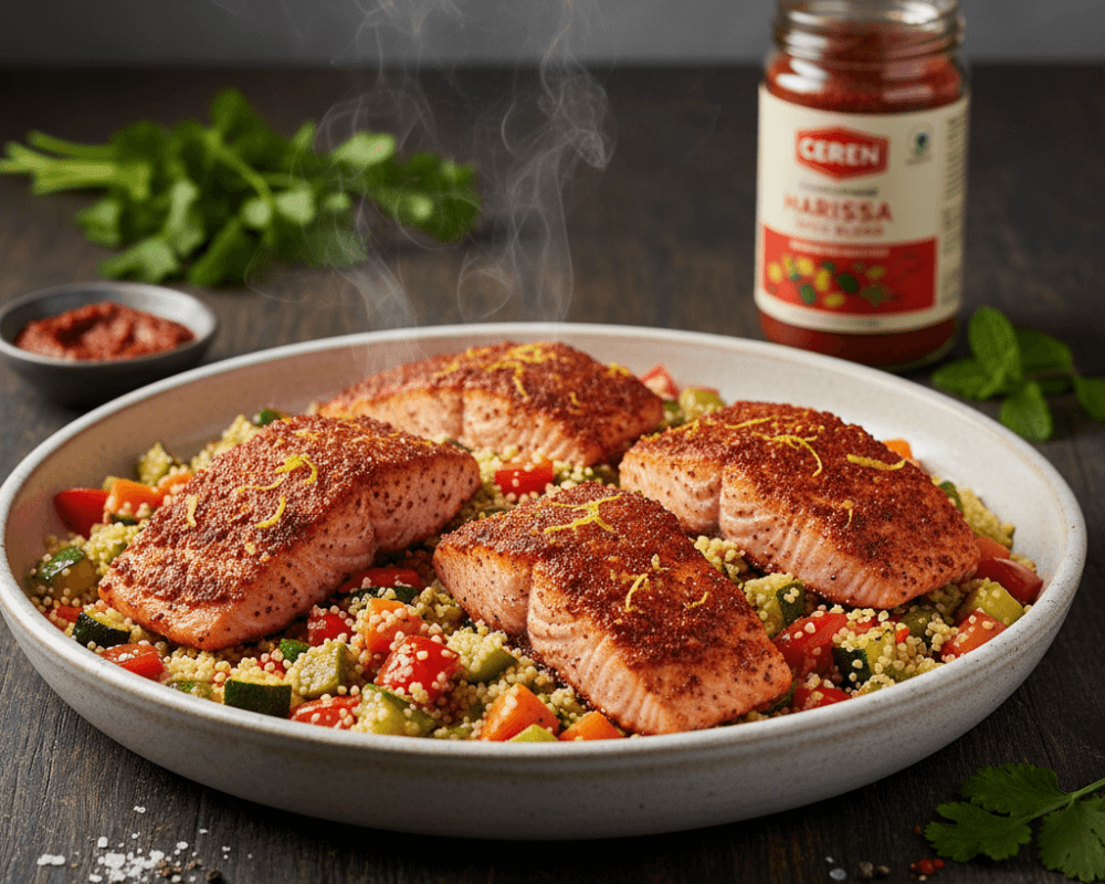 Harissa-Crusted Salmon with Roasted Vegetable Couscous