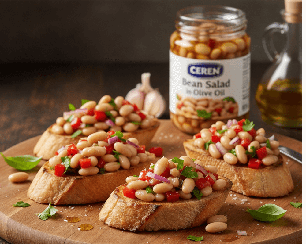 A light Italian-inspired appetizer made with crispy bread slices topped with CEREN Bean Salad in Olive Oil.
