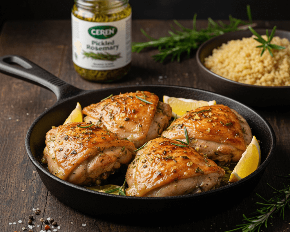 Marinate: In a bowl, mix lemon juice, olive oil, garlic, paprika, salt, pepper, and CEREN Pickled Rosemary. Coat chicken well. Let marinate at least 1 hour (overnight for best results).