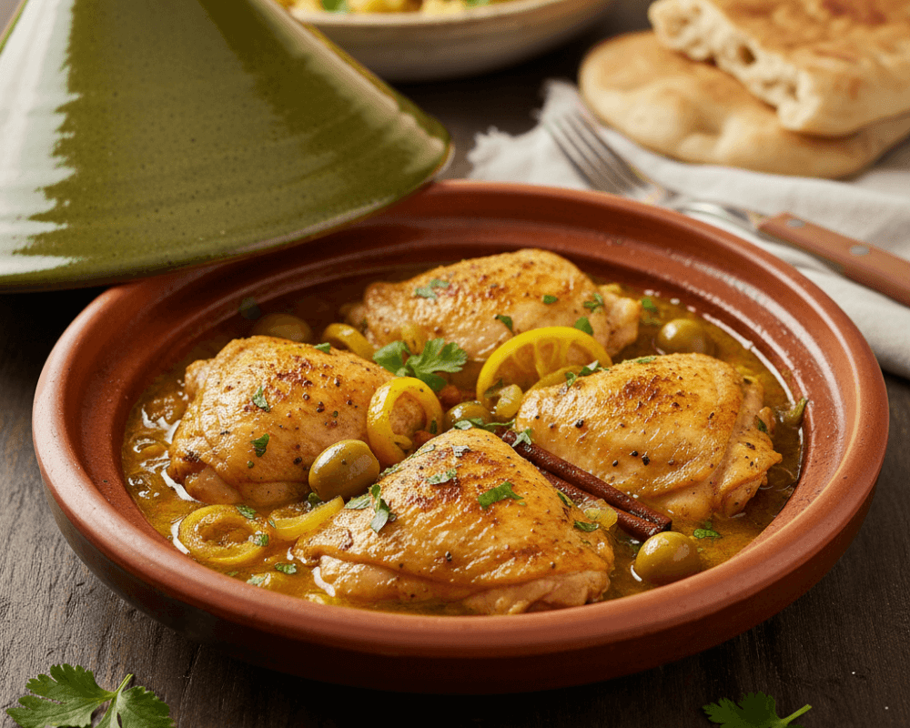 👉 A North African classic where cracked olives cut through the richness of spiced chicken.