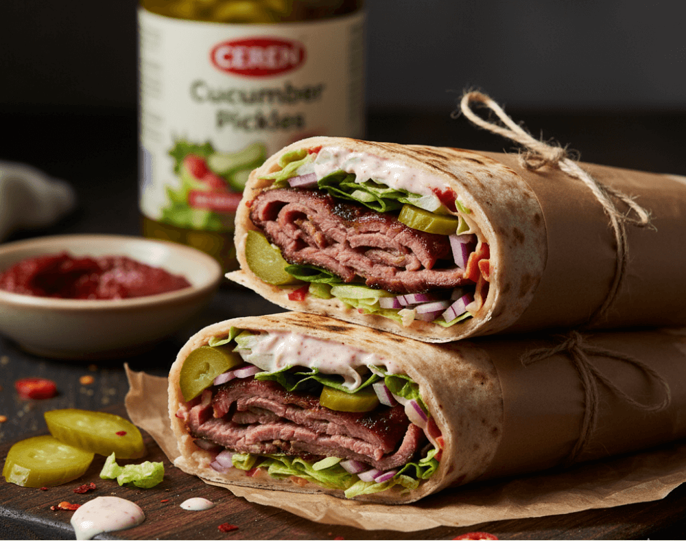 A Turkish street food–inspired wrap where CEREN Cucumber Pickles add crunch and tang.