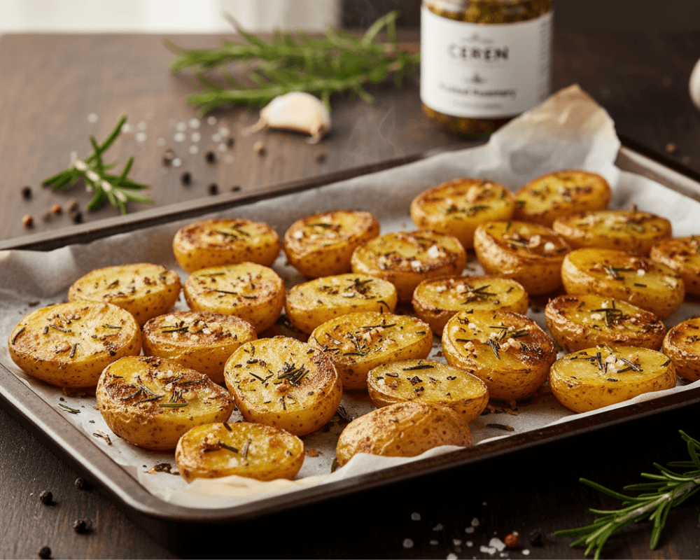 A rustic side dish where CEREN Pickled Rosemary infuses roasted potatoes with deep herbal flavor.