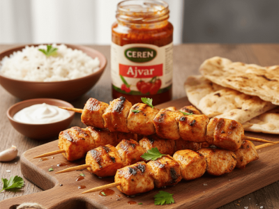Juicy chicken skewers marinated in CEREN Ajvar for smoky, tangy flavor. Ingredients 500 g chicken breast, cut into cubes 4 tablespoons CEREN Ajvar 2 tablespoons yogurt 2 tablespoons olive oil 2 cloves garlic, minced 1 teaspoon paprika Salt and black pepper, to taste Instructions Make marinade: Mix CEREN Ajvar, yogurt, olive oil, garlic,...