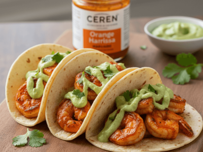 A fun street-food–style dish where CEREN Orange Harissa gives shrimp a citrusy heat. Ingredients 500 g shrimp, peeled & deveined 2 tablespoons CEREN Orange Harissa 1 tablespoon olive oil Juice of ½ lime 6 small tortillas 1 avocado 2 tablespoons yogurt or sour cream 1 tablespoon lime juice 1 teaspoon honey ...