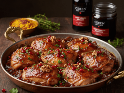 A luxurious sweet–sour dish inspired by Persian flavors, where CEREN Date Vinegar balances pomegranate’s fruity depth. Ingredients 6 chicken thighs (bone-in, skin-on) 3 tablespoons CEREN Date Vinegar ½ cup CEREN Pomegranate Molasses 1 onion, thinly sliced 2 cloves garlic, minced 2 tablespoons olive oil 1 teaspoon turmeric ½ teaspoon cinnamon 1...