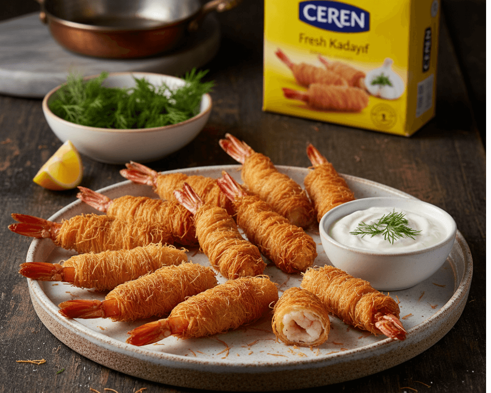 Savory Kadayıf-Wrapped Shrimp with Garlic Yogurt Dip