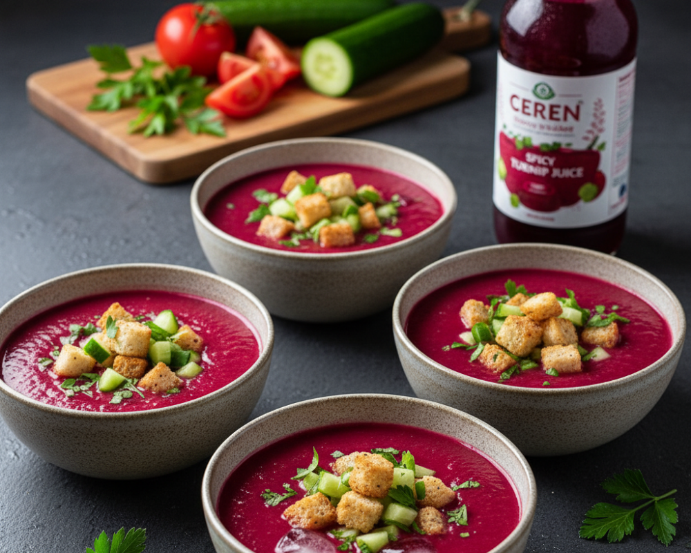 Gazpacho, the famous cold soup of Spanish cuisine, is adapted this time with CEREN Spicy Turnip Juice. The turnip juice, combined with tomatoes and vegetables, adds extra depth and a spicy touch.