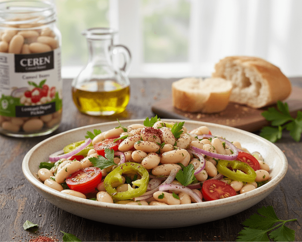 A protein-rich salad with white beans and tangy CEREN Lombardi Pepper Pickles.
